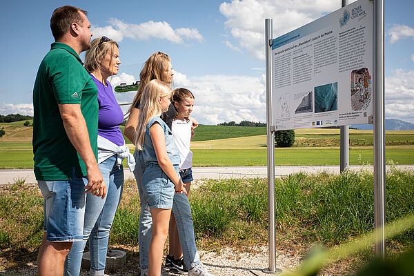 Bei dem Blick durch das "Fenster in die Vergangenheit" bekommen Sie einen (virtuellen) Eindruck von der ausgedehnten Anlage eines römischen Gutshofs, zusätzlich anschaulich erläutert auf einer Informationstafel.